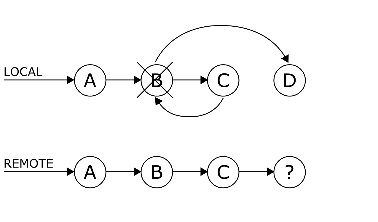 • Command opens your favorite editor where you write drop in front of commit B, but you leave default pick with all other commits. Save and exit the editor to perform a rebase. Remember: if you want to cancel delete whole file content before saving and exiting the editor