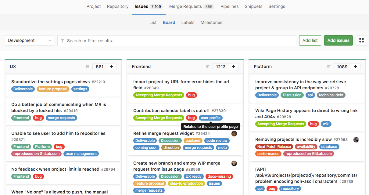 With GitLab Enterprise Edition Starter, you can also create various boards per project with Multiple Issue Boards.